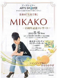 【アーツシャワー オペラシティの夏祭り2012 音楽の「たまて箱」】 MIKAKO 15周年記念コンサート 東京オペラシテイ コンサートホール 2012年8月6日 沢山の方にお越し頂きました。どうもありがとうございました! |