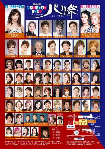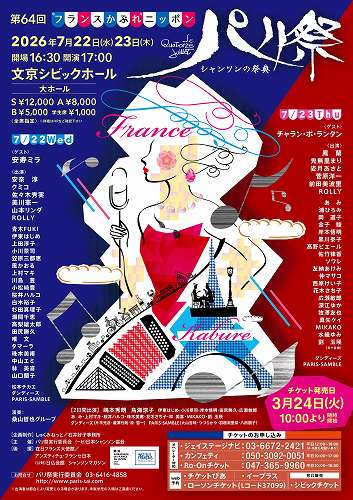 | 【3月ライブスケジュール】 4日(水)新宿シャンパーニュ シャンパーニュ開店54周年記念 MIKAKOソロライブ ピアノ 木並和彦さん 開場18:30 開演19:00 2ステージ 前売り¥6,000 当日¥7,000(フリードリンク) 15日(日)群馬県渋川市 日本シャンソン館 MIKAKOライヴ 開演14:00 ライブ料金¥1,000(入館料別途) 27日(金)横浜・中華街デュモン 開場18:30 開演19:00 2ステージ ¥5,000(1ドリンク付) 28日(土)(午後)あやめの苑・代々木(デイサービス) MIKAKOコンサート 開演14:00 29日(日)カフェ・ド・リヨン コンサート2026「東中野 パリ動物公園」 開場16:30 開演17:00 ¥7,000(全席指定) 会場: 草月ホール ![]() 30日(月)(午後)あやめの苑・代々木(デイサービス) MIKAKOコンサート 開演14:00 31日(火)(午後)あやめの苑・代々木(デイサービス) MIKAKOコンサート 開演14:00 【4月ライブスケジュール】 15日(水)横浜・中華街デュモン 開場18:30 開演19:00 2ステージ ¥5,000(1ドリンク付) 19日(日)群馬県渋川市 日本シャンソン館 MIKAKOライヴ 開演14:00 ライブ料金¥1,000(入館料別途) 22日(水)MIKAKOライブ@自由が丘ラマンダ pf:日野香織さん 開場18:00 開演18:30 2ステージ ¥6,600(1ドリンク付) 【5月ライブスケジュール】 30日(土)新宿シャンパーニュ 矢田部道一の世界を歌う 開場18:30 開演19:00 2ステージ 前売り¥6,000 当日¥7,000(フリードリンク) 【6月ライブスケジュール】 24日(水)MIKAKOライブ@自由が丘ラマンダ 開場18:00 開演18:30 2ステージ ¥6,600(1ドリンク付) 【7月ライブスケジュール】 15日(水)名古屋パリ祭 会場:愛知県芸術劇場 開演 18:00 22日(水)第64回パリ祭 “フランスかぶれ”ニッポン 23日(木)第64回パリ祭 “フランスかぶれ”ニッポン ソロ出演日 会場:文京シビックホール 大ホール 開場 16:30 開演 17:00 S席 ¥12,000 A席 ¥8,000 B席 ¥5,000学生席 ¥1,000〈全席指定〉 ![]() ![]() 【8月ライブスケジュール】 26日(水)MIKAKOライブ@自由が丘ラマンダ 開場18:00 開演18:30 2ステージ ¥6,600(1ドリンク付) 【9月ライブスケジュール】 21日(月)群馬県前橋市 大利根町敬老会 【10月ライブスケジュール】 28日(水)MIKAKOライブ@自由が丘ラマンダ 開場18:00 開演18:30 2ステージ ¥6,600(1ドリンク付) 【11月ライブスケジュール】 【12月ライブスケジュール】 23日(水)MIKAKOライブ@自由が丘ラマンダ 開場18:00 開演18:30 2ステージ ¥6,600(1ドリンク付) |